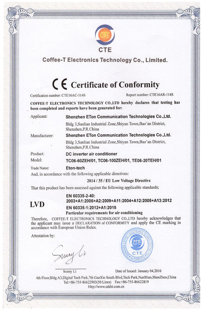 Estándar:CE Número:CTE16AR-114S Fecha de emisión:2016-01-04 Ámbito de aplicación / Cocina:Industrial DC air conditioner(LVD) Emitido por:CTE |