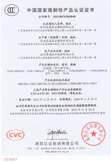 Estándar:3C Número:2015180703000848 Fecha de emisión:2016-11-29 Fecha de caducidad:2020-11-19 Ámbito de aplicación / Cocina:Air conditioner Emitido por:CVC |